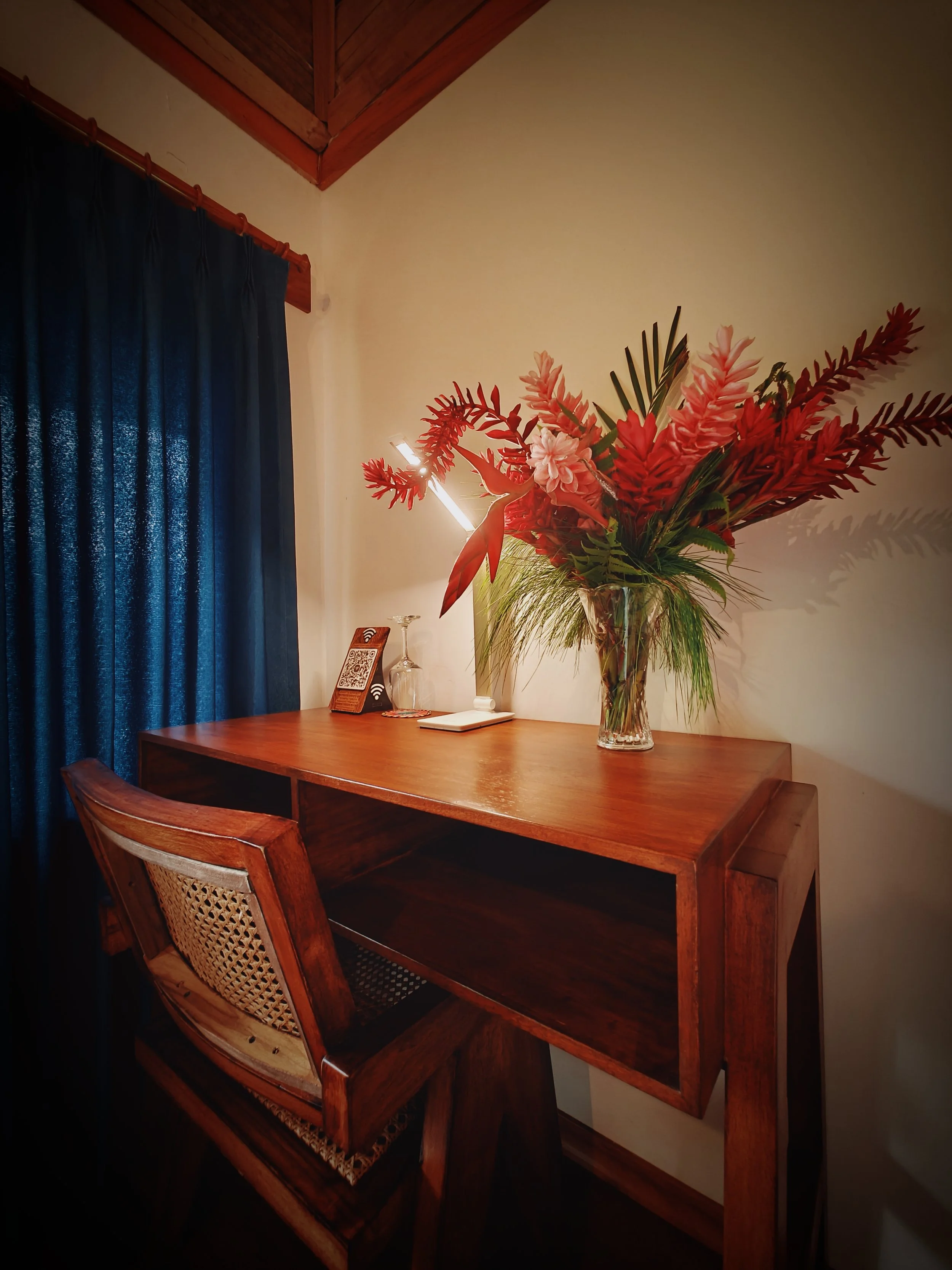 Entra y deja que el suave resplandor de la lámpara te guíe hasta la cama tamaño queen, la pieza central de tu chalet.